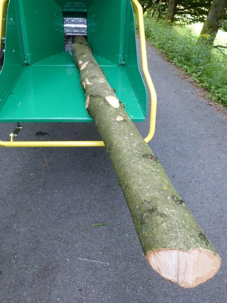 = äußerst starker Einzug auch bei widerspenstigem Material (massives Stammholz, starke Verzweigungen, Grünschnitt)