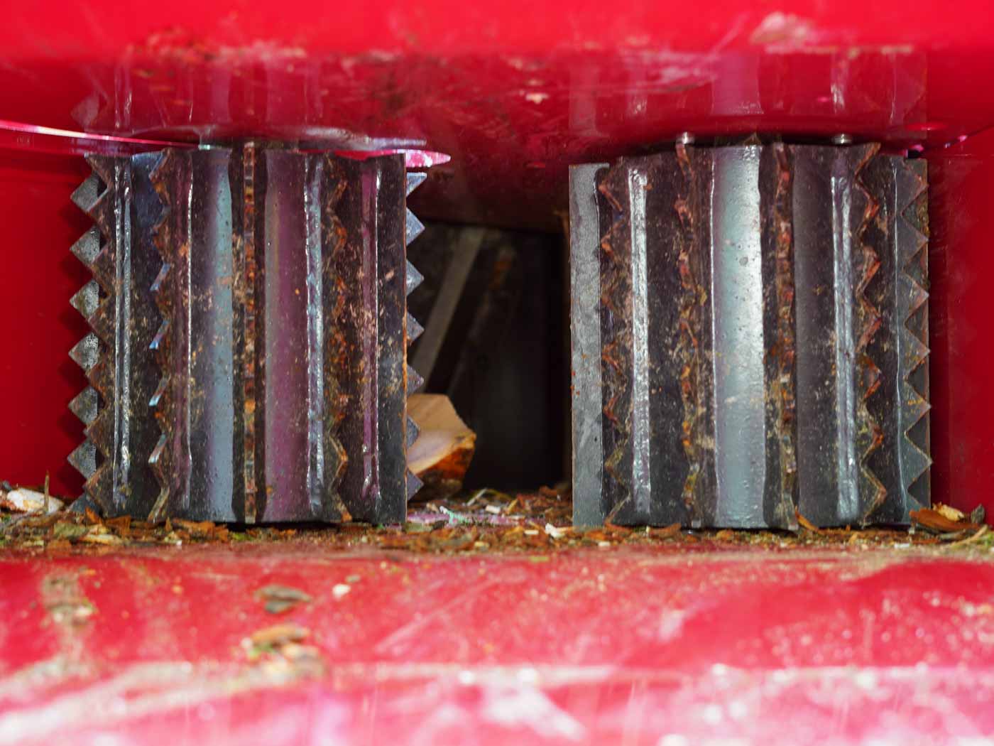 = 2 senkrecht stehende, massive Walzen mit Einzugskrallen für optimalen Materialeinzug