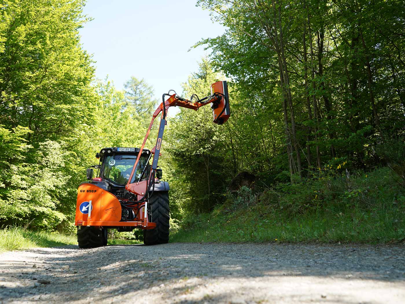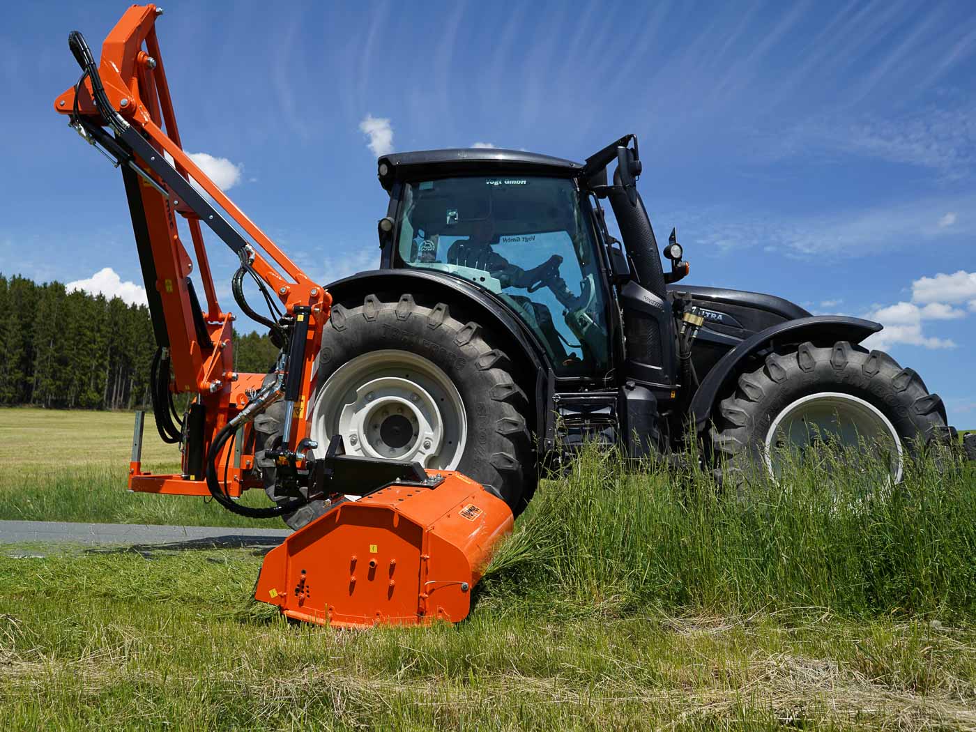 = Auslegearm kann seitlich des Schleppers nach vorne bewegt werden