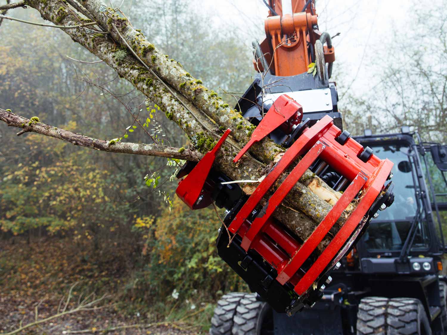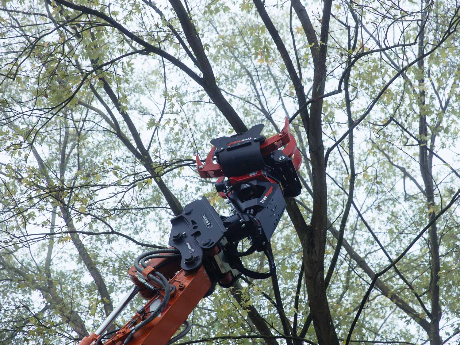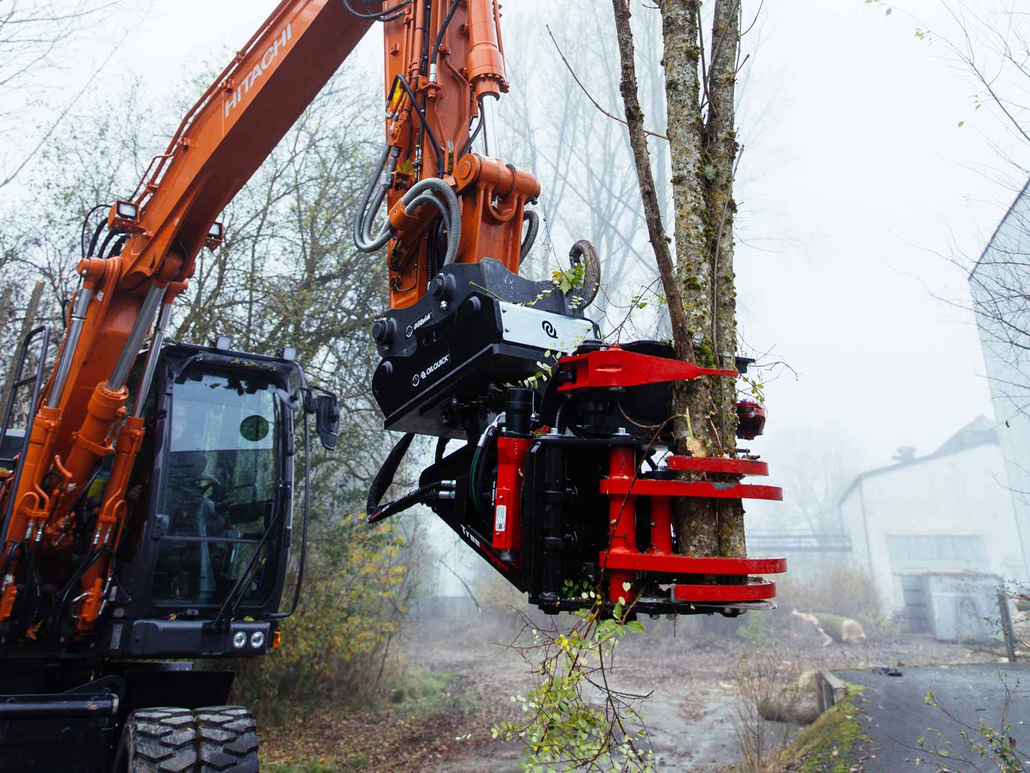 Robuster Fällgreifer für Materialstärken bis 300 mm zum Anbau an Bagger & Lader. TREE HUGGER Serie X - Made in Finland.