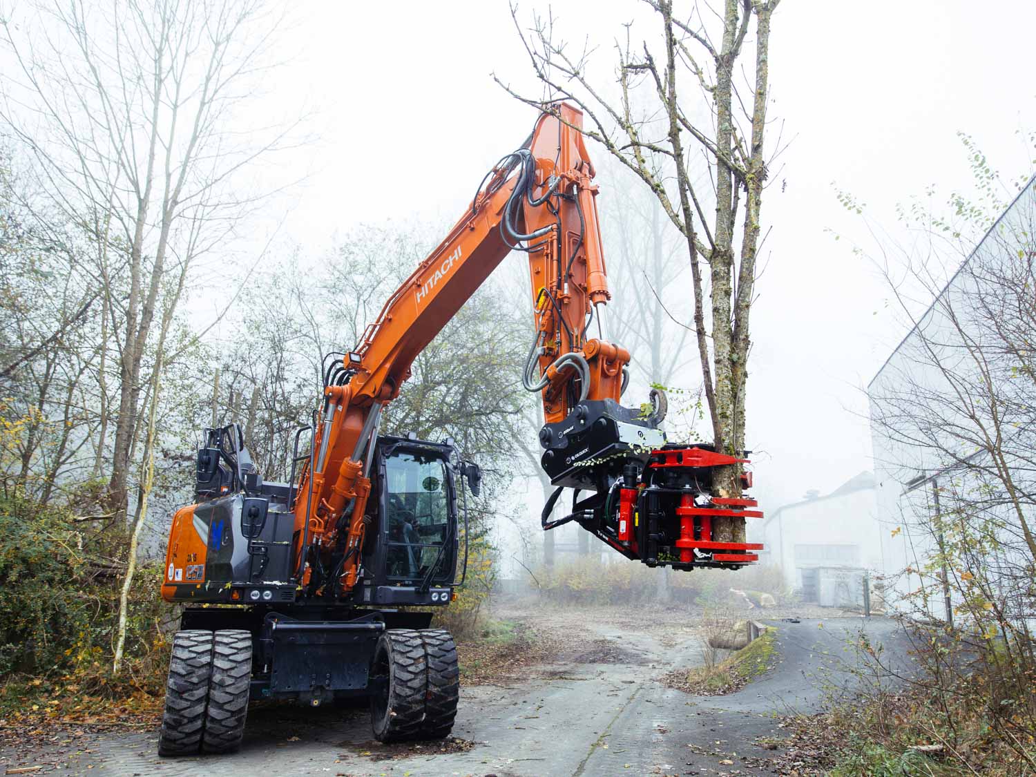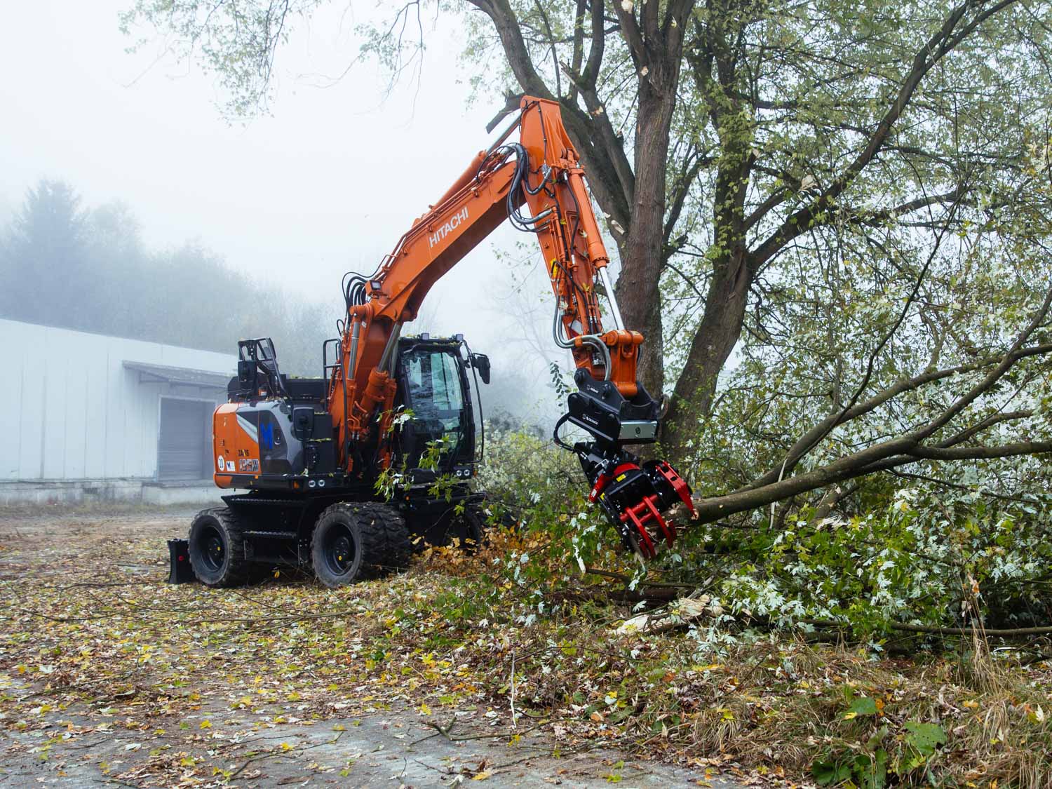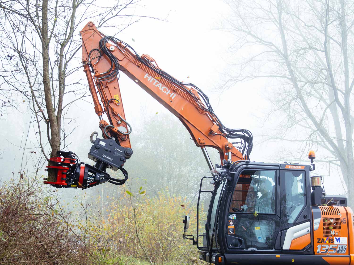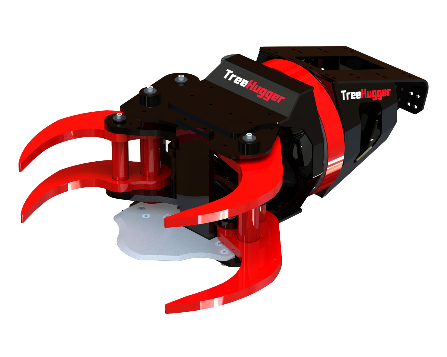 Robuster Fällgreifer für Materialstärken bis 300 mm zum Anbau an Bagger & Lader. TREE HUGGER Serie X - Made in Finland.